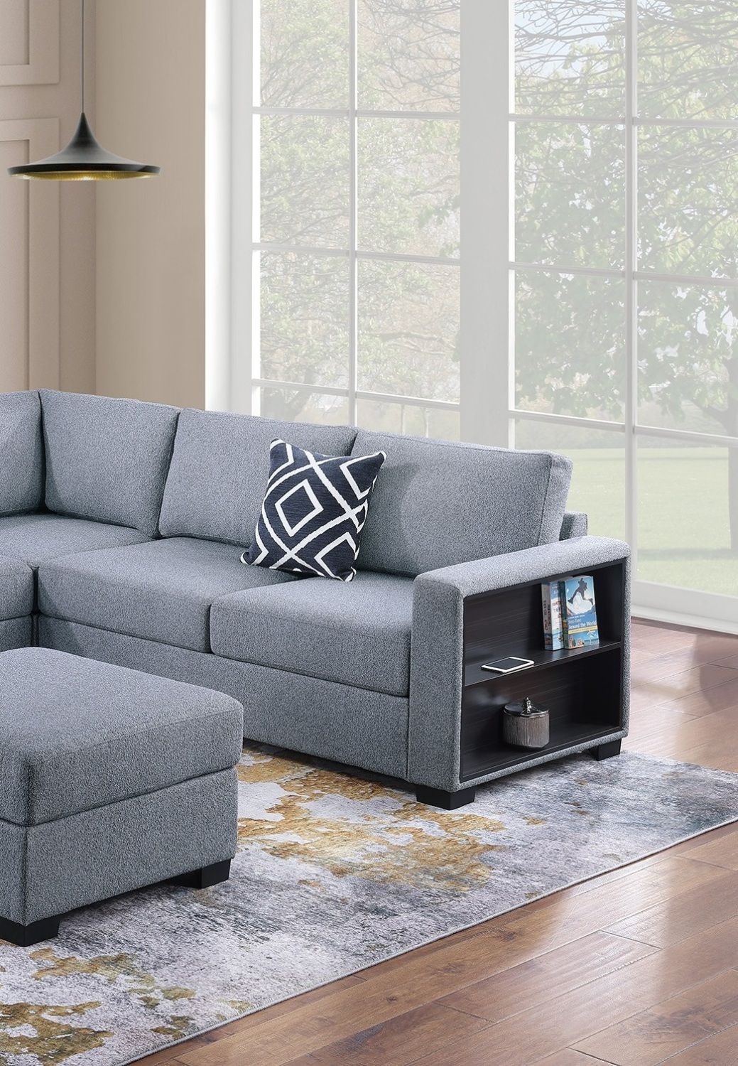 Home > Contemporary Functional Sectional Sofa 4pc Set Gray Boucle with Built-in Shelfs Wedge, Ottoman