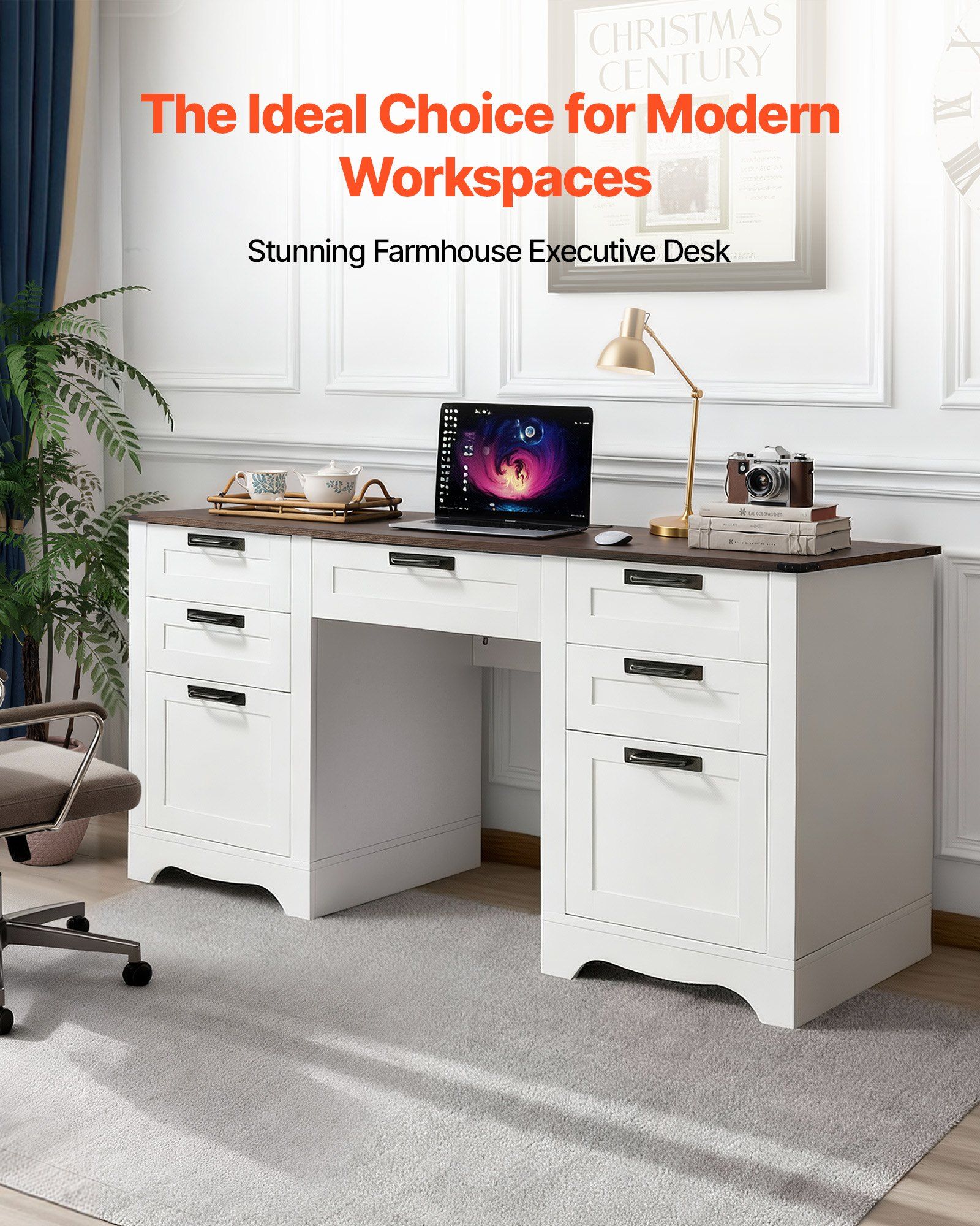 1.Stunning Farmhouse Desk: Our executive desk features dual bases and drawers with linear trim. The white and walnut finish adds a cozy, rustic farmhouse touch, making it versatile for any decor, ideal for offices, bedrooms, studies, or living rooms
